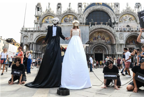 أعضاء من مجموعة الناشطين البيئيين يتظاهرون بساحة سان ماركو في البندقية