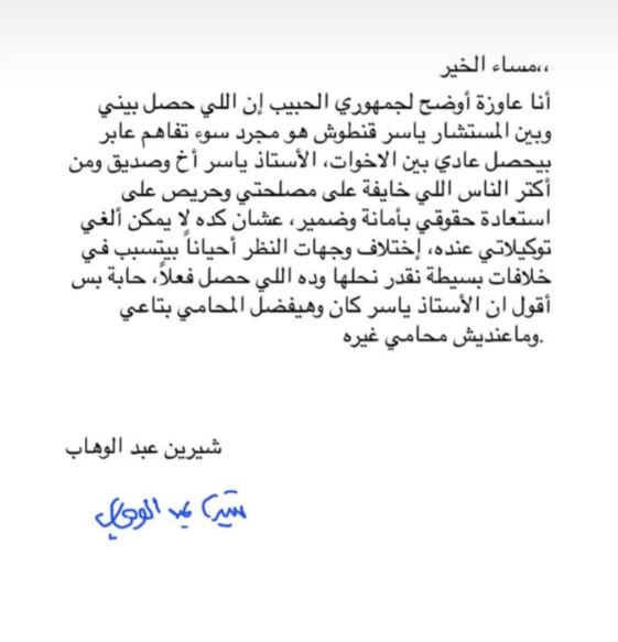 وقالت شيرين عبد الوهاب، في بيانٍ توضيحي، "أنا عاوزة أوضح لجمهوري الحبيب، إن اللي حصل بيني وبين المستشار ياسر قنطوش هو مجرد سوء تفاهم عابر بيحصل عادي بين الأخوات.. الأستاذ ياسر أخ وصديق ومن أكتر الناس اللي خايفة على مصلحتي، وحريص على استعادة حقوقي بأمانة وضمير".