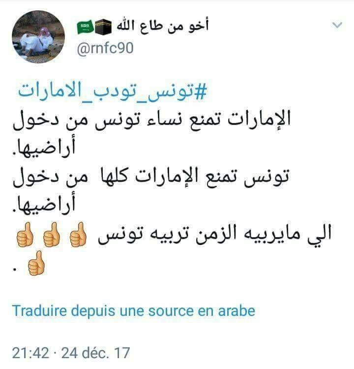 وقد احتل الهاشتاغ مركزا متقدما في لائحة الهاشتاغات الأكثر تداولا في السعودية وقطر ليحصد أكثر من 30 ألف تغريدة في أقل من 24 ساعة. وعبّر مغردون عرب عن تضامنهم مع تونس ضد ما وصفوه بالقرار العنصري الذي طال التونسيات وأثنوا على القرار التونسي بتعليق الرحلات نحو الإمارات ووصفوه بالمشرّف.