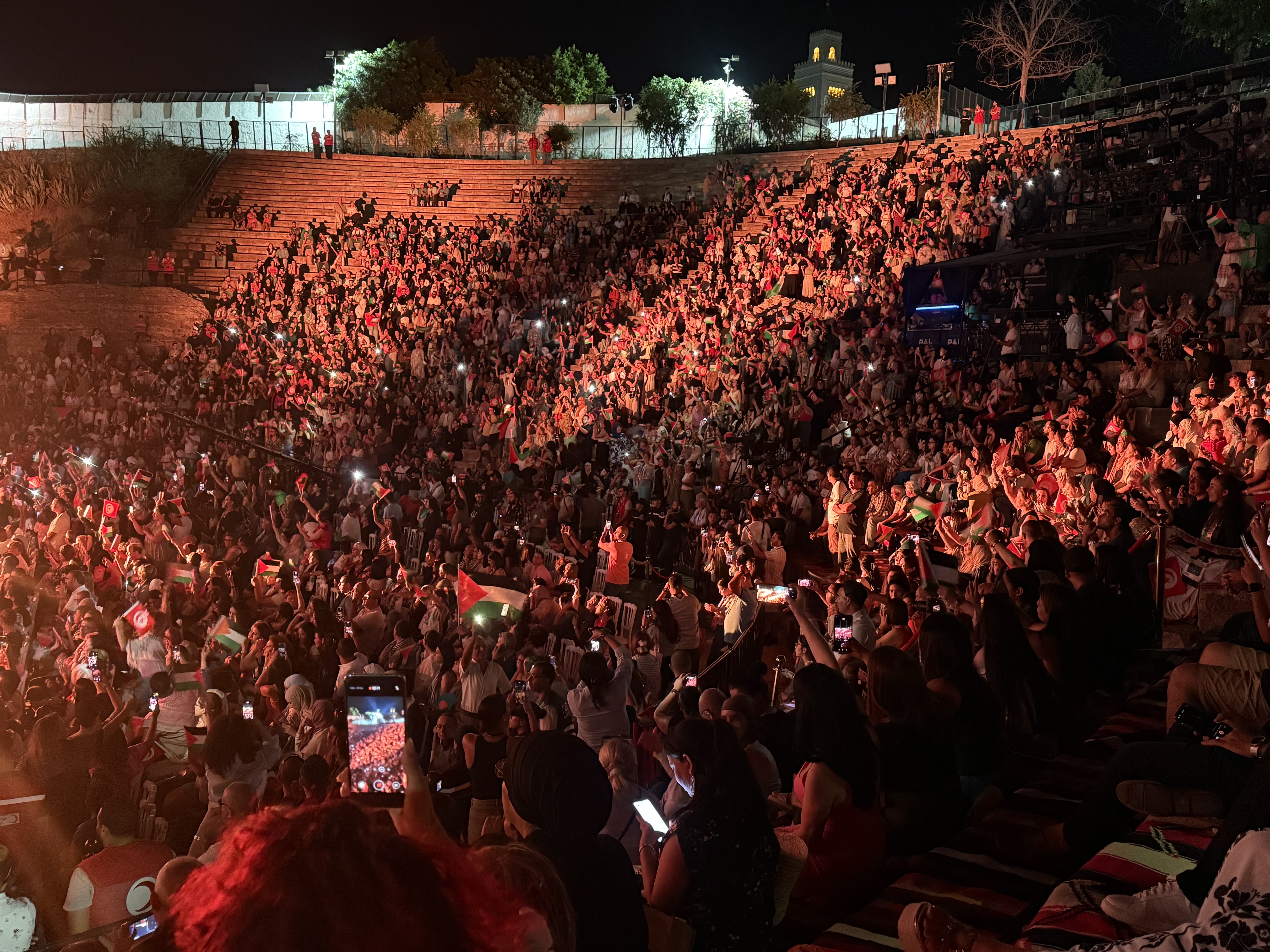 هتف الحاضرون قبل انطلاق العرض 'الحرية لفلسطين ' ورفرف العلم الفلسطيني والعلم التونسي وملأ الحماس مدارج المهرجان.