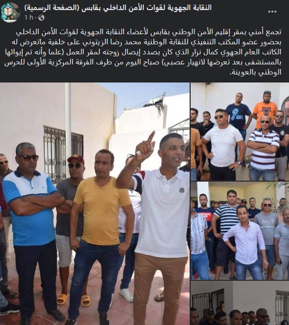 تجمّع عدد من أعضاء النقابة الجهويّة لقوات الأمن الداخلي، صباح اليوم الإثنين 29 أوت 2022، بمقرّ إقليم الأمن الوطني بقابس احتجاجا على "عملية جلب الفرقة المركزية الأولى للحرس الوطني بالعوينة للكاتب العامّ الجهوي لنقابة قوات الأمن الداخلي المطلوب للمحكمة العسكرية"، حسبما أفادت به النقابة الجهويّة لقوات الأمن الداخلي بقابس في تدوينة عبر صفحتها الرسمية على موقع التواصل الاجتماعي "فيسبوك".