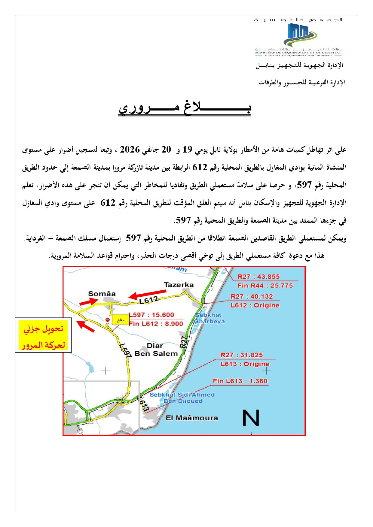 أعلنت الإدارة الجهوية للتجهيز والإسكان بنابل، اليوم الخميس، أنّه سيتم غلق الطريق المحلية رقم 612 -مُؤقّتا- على مستوى وادي المغازل في جزئِها الممتد بين مدينة الصمعة والطريق المحلية رقم 597.