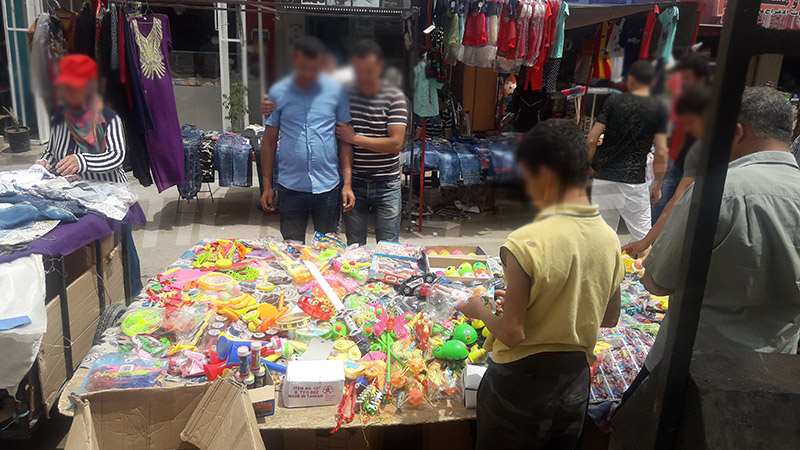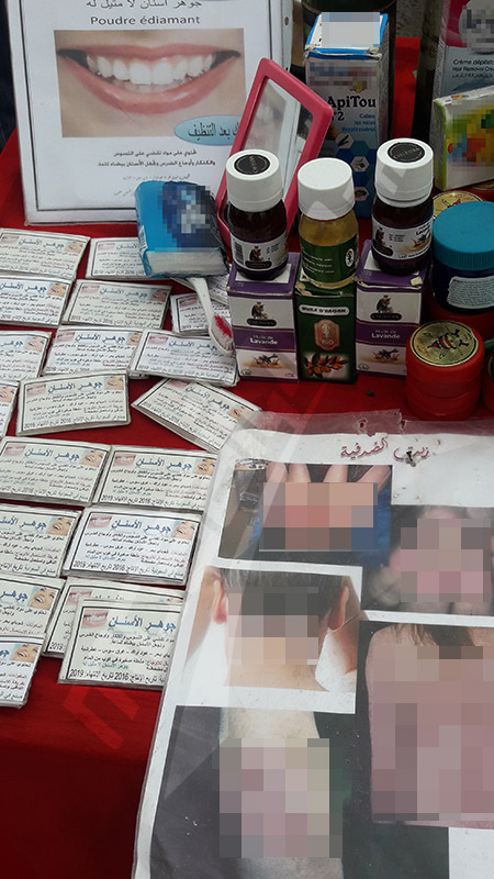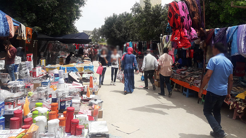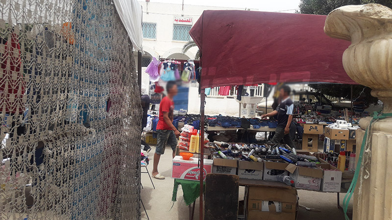 كما أن أغلب البضائع التي يعرضها الباعة المنتصبون فوضويا مجهولة المصدر وذات جودة متدنية (مواد التجميل والعطورات والسجائر المهربة وألعاب أطفال مقلدة) علاوة على كثرة الملابس المستعملة (الفريب) بالإضافة إلى المواد الغذائية وكذلك الخضر والغلال معروضة في الطريق..