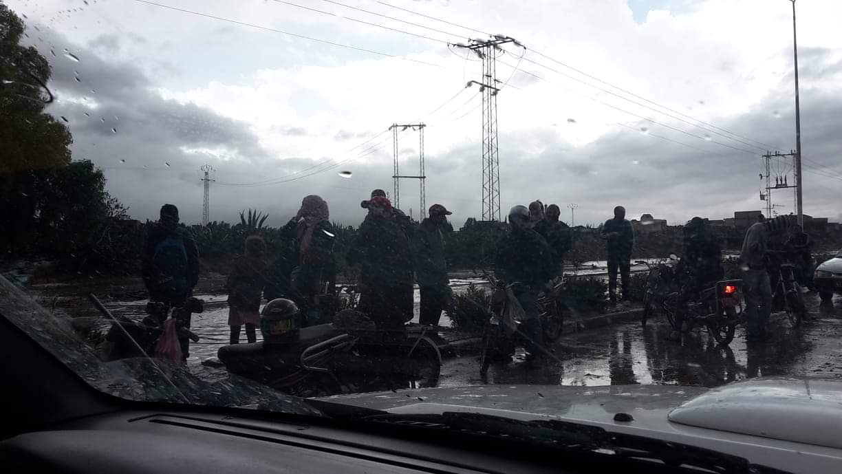 وقد تراكمت مياه الأمطار في ساحة المدرسة الابتدائية فاضل بن عاشور في حي النور في مدينة القصرين.