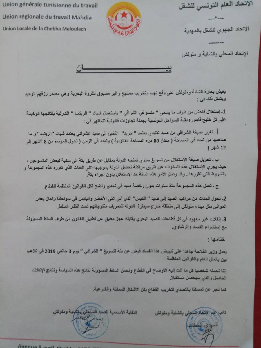 وفي تصريح لموزاييك، أكد الكاتب العام المساعد للاتحاد المحلي الشابة ملولش البحري الهذيلي، أن ''حالة من الغليان والغضب تسود في صفوف صغار البحارة، وأنهم يهددون بهجرة غير شرعية جماعية في إتجاه سواحل إيطاليا نظرا إلى التسويف المتواصل من طرف سلطة الإشراف وتجاهل مطالب البحارة المتكررة بتطبيق القانون ووضع حد للصيد العشوائي الذي تمارسه فئة متنفذة من البحارة وبات يهدد لقمة عيش بقية البحارة ويوشك على إتلاف الثروة السمكية بالجهة''.