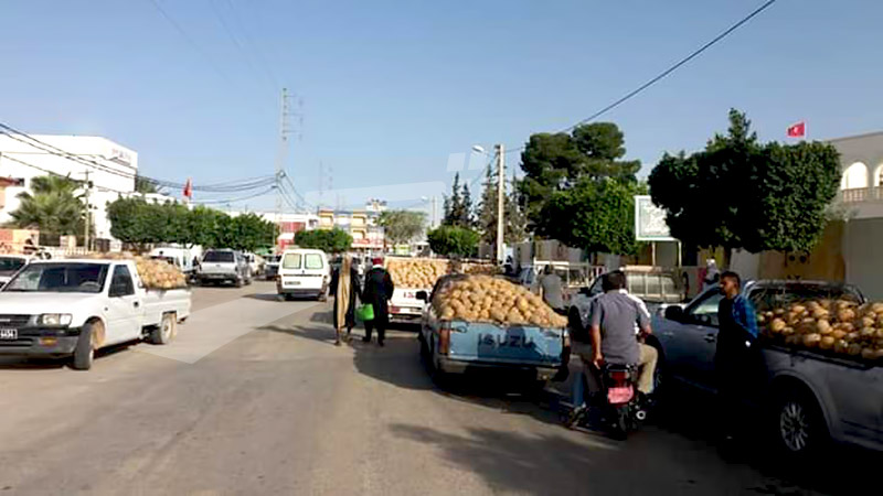 نظم اليوم الاثنين 11 ماي 2020 عدد هام من فلاحي معتمدية الرقاب التابعة لولاية سيدي بوزيد مصحوبين بسياراتهم المحملة بالبطيخ وقفة احتجاجية أمام مقر معتمدية المكان وذلك على خلفية غلق سوق ''البطيخ'' الكائن بمنطقة ''الدلاهمية'' ومنعهم من الانتصاب هناك.