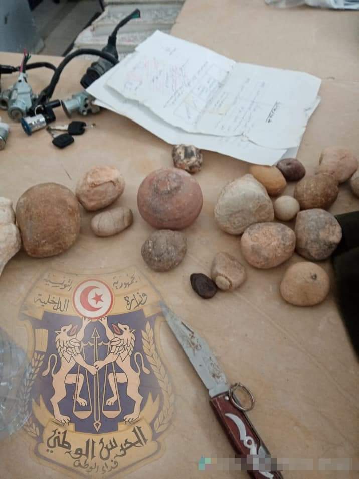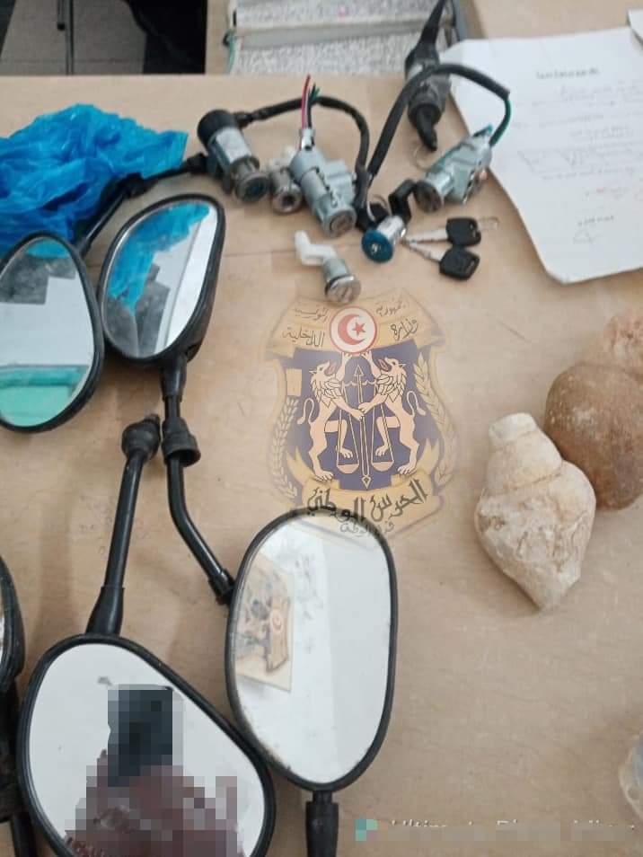 على إثر ورود معلومات مؤكدة على الجهات الامنية التابعة لفرقة الابحاث والتفتيش بالرقاب مفادها تورط شخص أصيل أحواز منطقة " أولاد حفوز " التابعة لولاية سيدي بوزيد في سرقة و تفكيك و تدليس عقود دراجات نارية للغرض داهمت مساء أمس الخميس 26 أوت 2021 فرق أمنية المقر السكنى لذي الشبهة و تسنى للأعوان إلقاء القبض عليه و تم حجز دراجة نارية ومجموعة من مفاتيح تشغيل و أقفال الدراجات النارية و مجموعة عقود بيع دراجات نارية و نسخ عديدة من بطاقات التعريف الوطنية الى جانب 19 قطعة حجرية من المرجح ان تكون أثرية و زي عسكري.