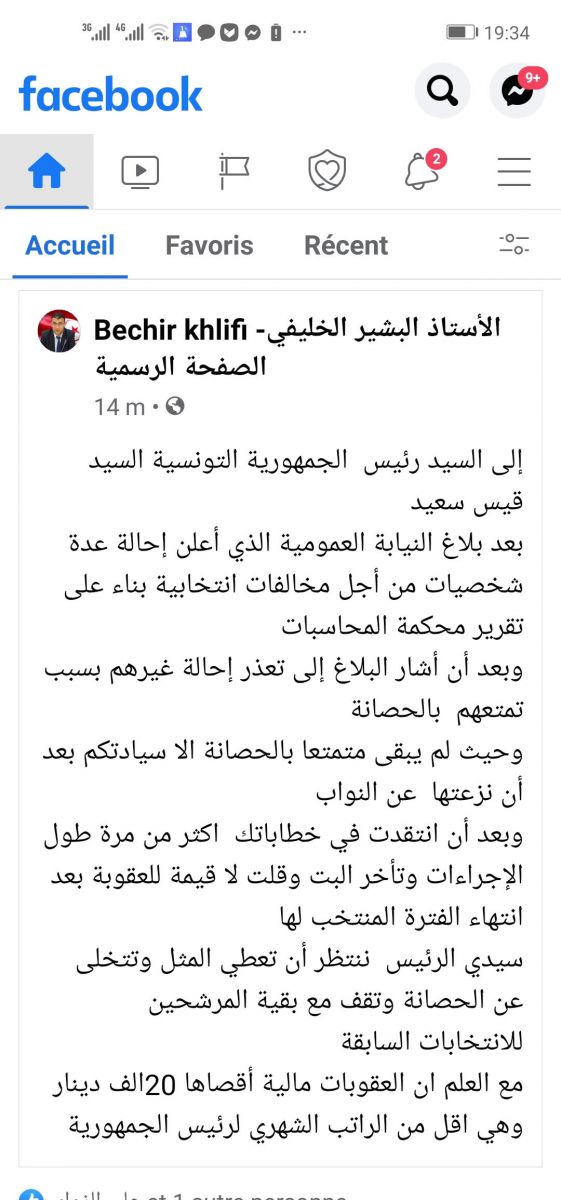 وطالب البشير الخليفي في تدوينته سعيّد بالتخلي عن الحصانة والوقوف مع بقية المرشحين للانتخابات السابقة، مذكرا بأنّ العقوبات مالية أقصاها 20 ألف دينار وهي أقلّ من الراتب الشهري لرئيس الجمهورية وفق ما جاء في التدوينة.