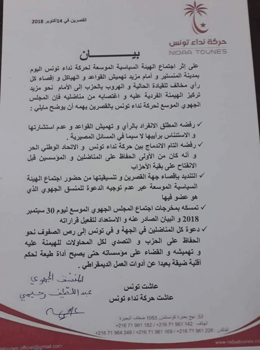 و دعا البيان إلى التصدي لما اعتبره "محاولات الهيمنة على حزب نداء تونس و القضاء على مؤسساته حتى يصبح اداة طيعة لحكم أقلية ضعيفة "، بحسب البيان.