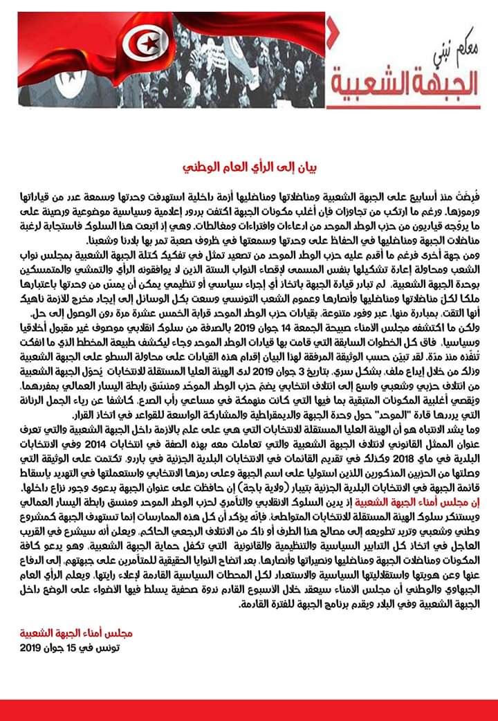 أدان مجلس أمناء الجبهة الشعبية في بيان ما اعتبره ''سلوكا انقلابيا وتآمريا لحزب الوطد الموحد ومنسق رابطة اليسار العمالي في محاولة للسطو على إسم الجبهة الشعبية''، من خلال إيداعهم ''ملفا بشكل سري لدى هيئة الانتخابات بتاريخ 3 جوان 2019 يحول الائتلاف من ائتلاف حزبي وشعبي واسع إلى ائتلاف انتخابي يضم الوطد ومنسق الرابطة بمفردهما'' وفق نص البيان.