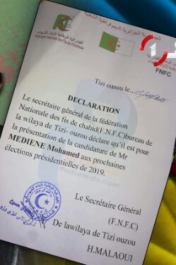 دعت تنسيقية أبناء الشهداء لولاية تيزي وزو في الجزائر المدير السابق لجهاز المخابرات الجنرال محمد مدين المدعو توفيق للترشح لمنصب رئيس الجمهورية بحسب بيان لذات الهيئة، علما وان التنسيقية الوطنية لأبناء الشهداء قد أعلنت قبل مدة دعمها لإعادة ترشيح الرئيس بوتفليقة.