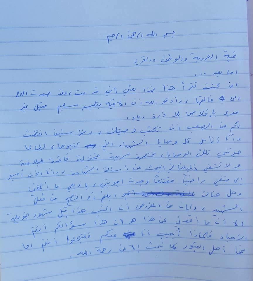 ''إن كنت تقرا هذا فهذا يعني أني قد مِت، وقد صعدت الروح إلى خالقها، وأدعو الله أن ألاقيه بقلبٍ سليم مقبل غير مدبر بإخلاص بلا ذرة رياء. لكم من الصعب أن تكتب وصيتك، ومنذ سنين انقضت وأنا أتأمل كل وصايا الشهداء التي كتبوها، لطالما حيرتني تلك الوصايا، مختصرة سريعة مختزلة فاقدة للبلاغة ولا تشفي غليلنا في البحث عن أسئلة الشهادة.