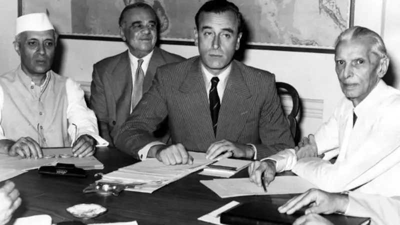 من اليسار.. الزعيم الهندي جواهر لال نهرو، والمندوب السامي البريطاني في الهند اللورد ماونتباتن، وزعيم المسلمين في الهند محمد علي جناح