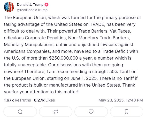 وقال ترامب في منشور على منصته الاجتماعية تروث سوشال "من الصعب جدا التعامل مع الاتحاد الأوروبي، الذي أُنشئ في المقام الأول لاستغلال الولايات المتحدة تجاريا (...) مناقشاتنا تراوح مكانها. في ظل هذه الظروف، أوصي بفرض رسم جمركي بنسبة 50% على الاتحاد الأوروبي، اعتبارا من الأول من جوان".