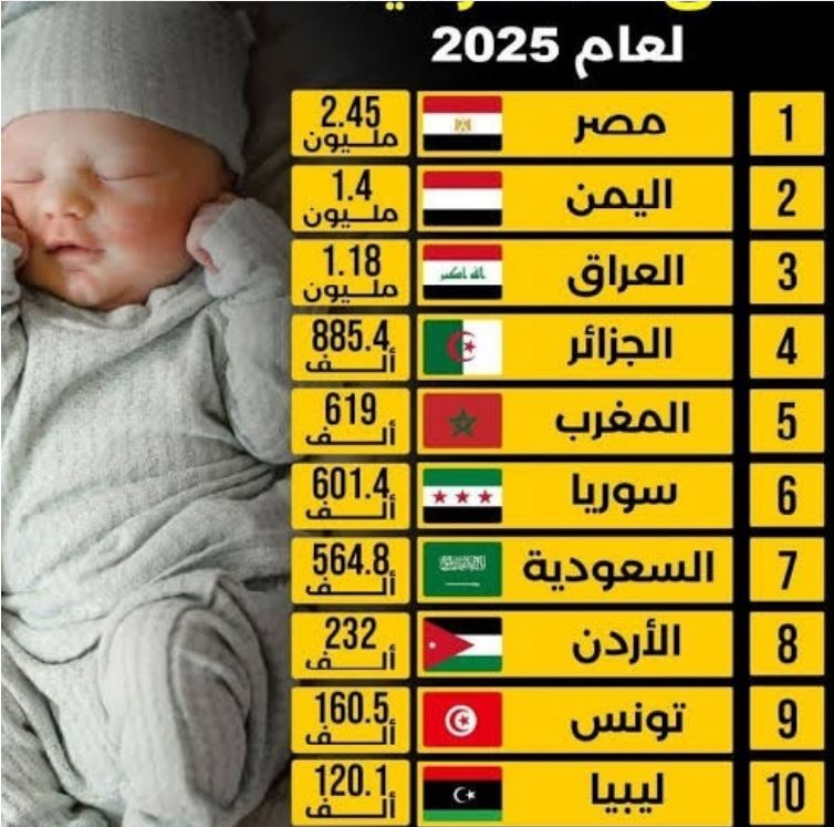 ووفقا لبيانات التوقعات السكانية العالمية للأمم المتحدة، تصدرت مصر القائمة عربيا بـ 2.45 مليون مولود، تلتها اليمن في المركز الثاني بـ 1.40 مليون مولود، وجاء العراق في المركز الثالث بـ1.18 مليون مولود، ثم الجزائر 855 ألفا، والمغرب 619 ألفا، وسوريا 601 ألف، والسعودية بـ 564 ألفا".