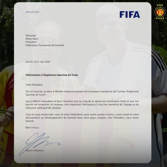 تلقى الترجي الرياضي التونسي الجمعة 23 ماي 2025 رسالة تهنئة من رئيس الاتحاد الدولي لكرة القدم جياني انفنتينو بمناسبة تتويجه بلقب البطولة التونسية.