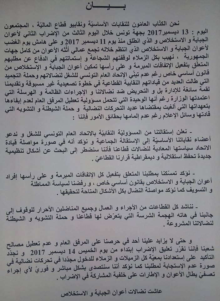 كما أعلن المستقيلون من إتحاد الشغل، عن قرار تعليق إضراب أعوان الجباية والاستخلاص، ابتداء من يوم غد الخميس.