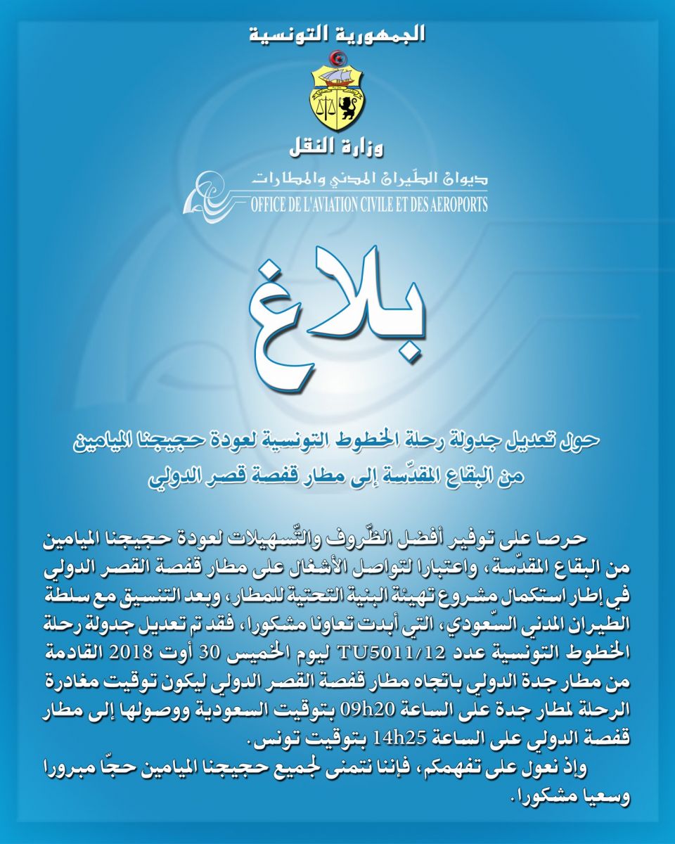 أعلن ديوان الطيران المدني والمطارات في بلاغ اليوم الأربعاء 29 أوت 2018 تعديل جدولة رحلة الخطوط التونسية لعودة الحجيج التونسيين من البقاع المقدسة إلى مطار قفصة الدولي.