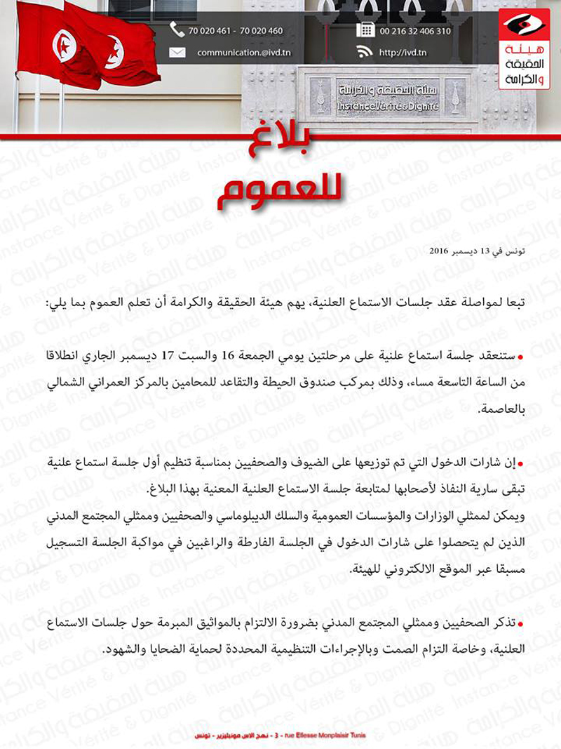 أعلنت هيئة الحقيقة والكرامة مساء اليوم الثلاثاء 13 ديسمبر 2016 أنها ستستأنف هذا الأسبوع عقد جلسات الاستماع العلنية.