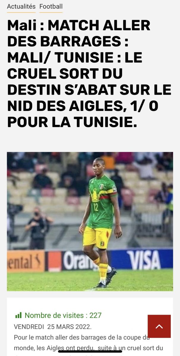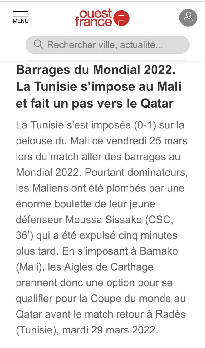 حقق المنتخب الوطني التونسي أمس الجمعة 25 مارس 2022 انتصاراً ثميناً أمام نظيره المالي بهدف دون مقابل، ضمن ذهاب الدور الحاسم والأخير من التصفيات المؤهلة لكأس العالم قطر 2022.