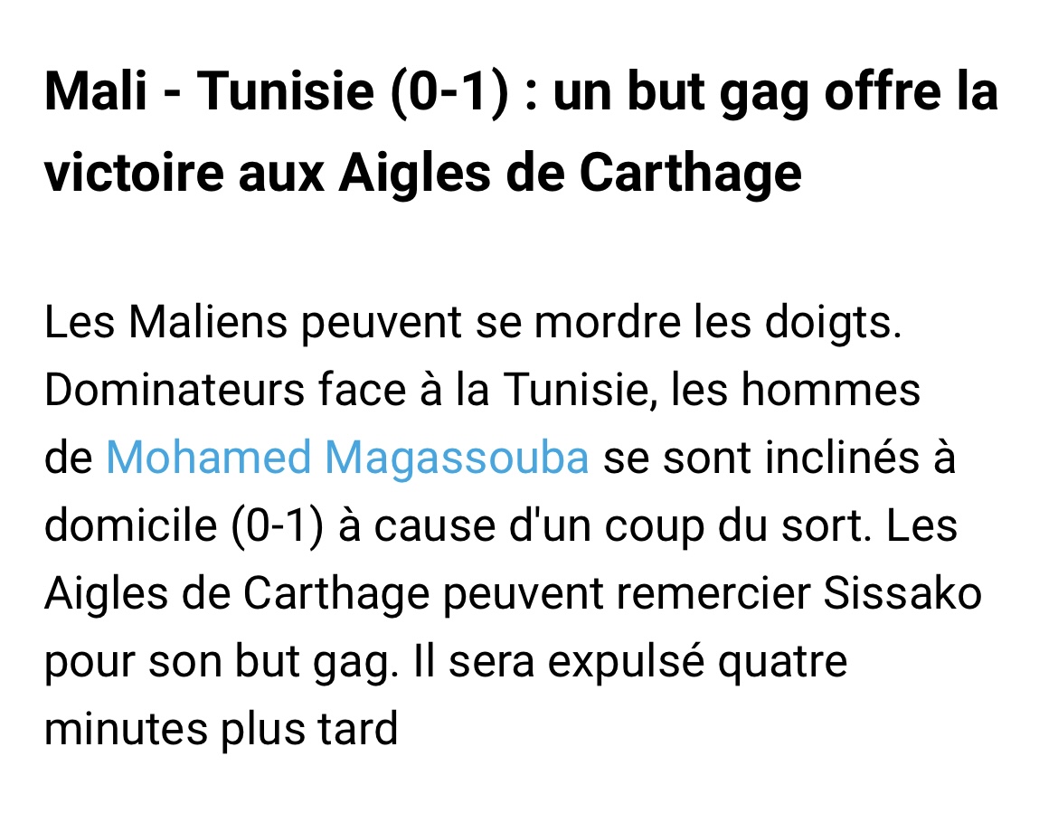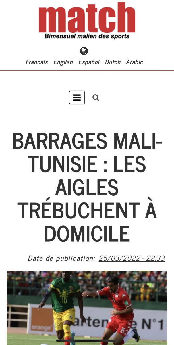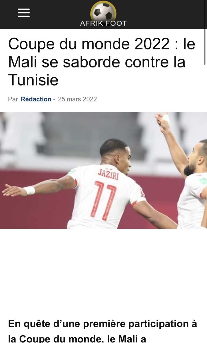 وقال موقع "أفريك فوت" إن المنتخب المالي سيطر على فترات عديدة من المواجهة التي جمعته بنظيره التونسي، وفقاً لتعبيره، لكنه فشل في تسجيل هدف الفوز بالرغم من تعزيز صفوف نسور مالي بلاعبين جدد متميزين على غرار متوسط ميدان إيفرتون عبدولاي دوكوري.