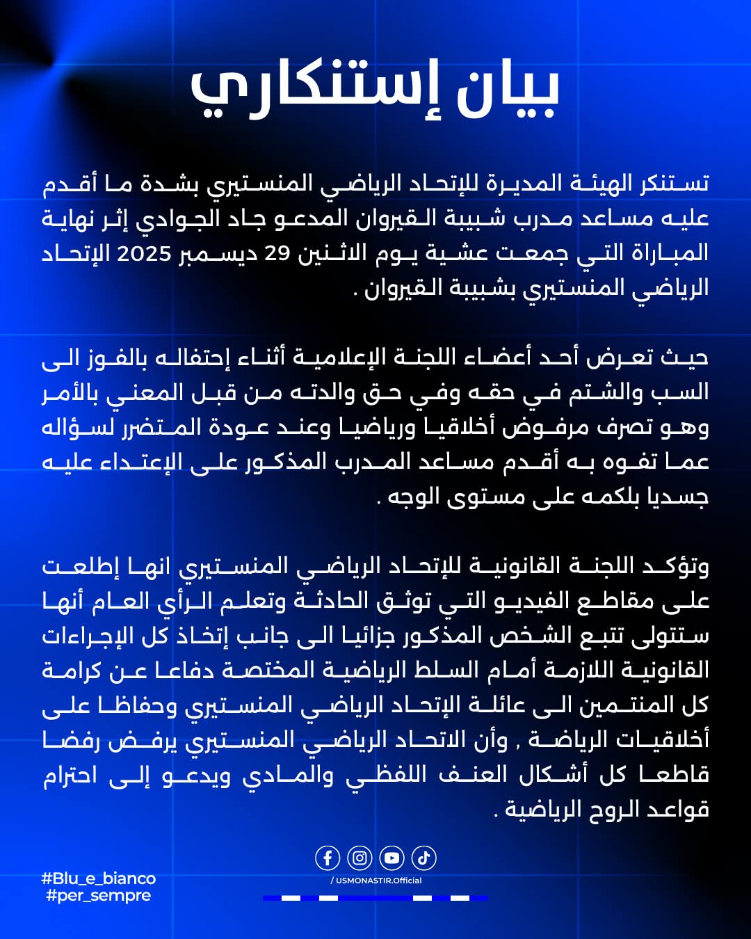 أصدر الاتحاد الرياضي المنستيري صباح اليوم الثلاثاء 30 ديسمبر 2025 عبر صفحاته الرسمية على مواقع التواصل الاجتماعي بلاغا استنكاريا، أكّد فيه ''تعرض أحد أعضاء اللجنة الإعلامية للاتحاد  المنستيري إلى الاعتداء اللفظي والجسدي من طرف  مدرب شبيبة القيروان جاد الجوادي إثر نهاية  مباراة كرة السلة أمس الإثنين في قاعة مزالي الأولمبية بالمنستير''.