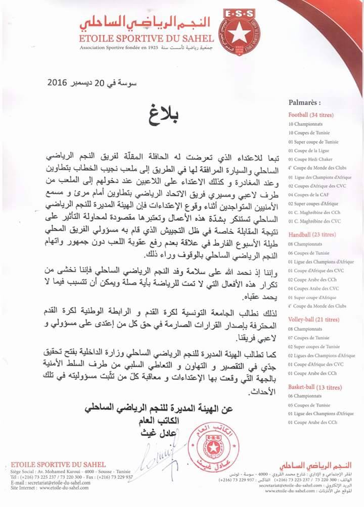 ونددت إدارة النجم الرياضي الساحلي في بلاغ اليوم الثلاثاء 20 ديسمبر 2016 ب'الاعتداء الذي تعرضت له الحافلة المقلّة لفريق النجم الساحلي والسيارة المرافقة له في الطريق إلى ملعب نجيب الخطاب بتطاوين وعند المغادرة وكذلك الاعتداء على اللاعبين عند دخولهم إلى الملعب من طرف لاعبي ومسيري فريق الاتحاد الرياضي بتطاوين أمام مرأى ومسمع الأمنيين المتواجدين أثناء وقوع الاعتداءات..' حسب نص البلاغ.