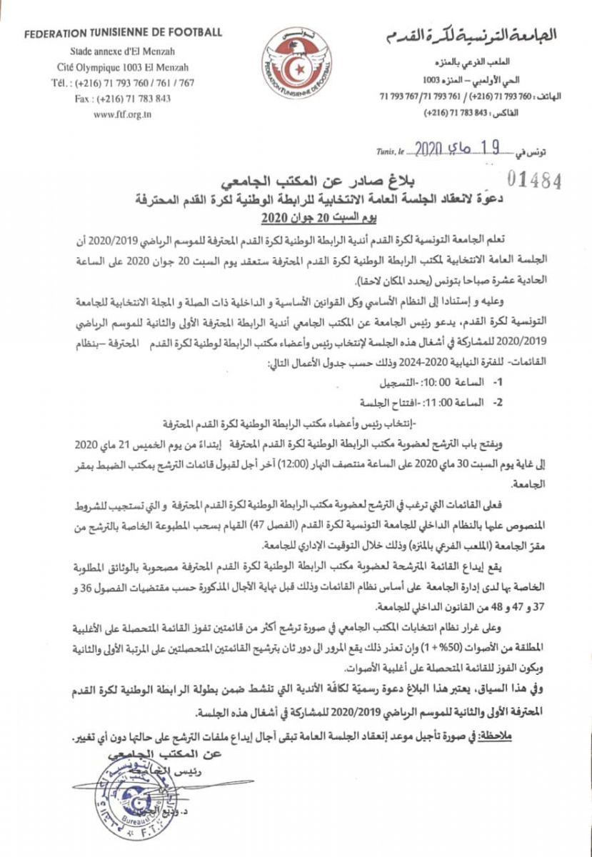 أعلنت الجامعة التونسية لكرة القدم اليوم عن موعد الجلسة العامة الانتخابية للرابطة الوطنية لكرة القدم المحترفة وذلك يوم 20 جوان 2020 في مكان سيقع تحديده لاحقا.