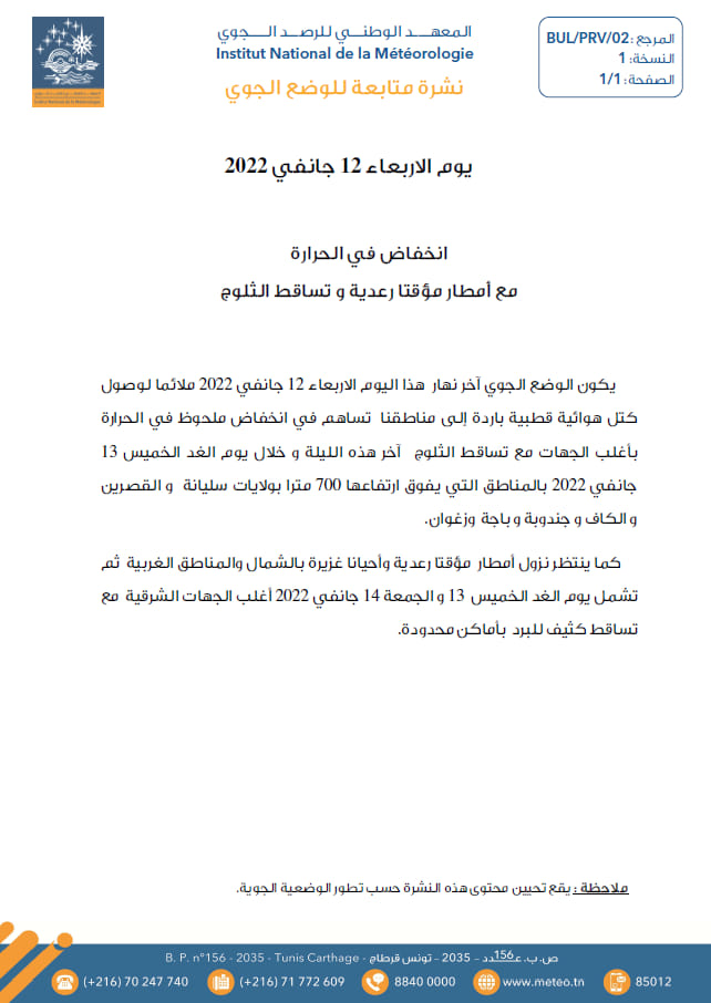 أفاد المعهد الوطني في نشرة متابعة للوضع الجوي بأنّ الوضع الجوّي آخر نهار هذا اليوم الأربعاء 12 جانفي 2022 سيكون ملائما لصول كُتل هوائية قطبية باردة إلى البلاد التونسية، وهو ما سيساهم في انخفاض ملحوظ في درجات الحرارة بأغلب الجهات مع تساقط الثلوج آخر هذه الليلة وغدّا الخميس بالمناطق التي يفوق ارتفاعها 700 مترا بولايات سليانة والقصرين والكاف وجندوبة وباجة وزغوان.