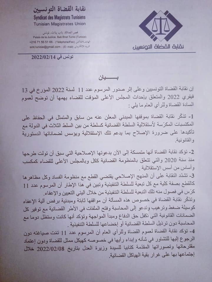 أكّدت نقابة القضاة التونسيين، في بيان لها اليوم الإثنين 14 فيفري 2022، أنّه تمت صياغة المرسوم عدد 11 المتعلّق بإحداث مجلس أعلى مؤقّت للقضاء دون الرجوع إليها للتشاور معها في شأنه وإبداء رأيها في خصوصه كهيكل ممثل للقضاة ودون اعتماد مقترحاتها وتصوراتها المقدّمة كتابيا لوزير العدل بتاريخ 8 فيفري الجاري خلال اجتماعها بها على غرار بقية الهياكل القضائية.