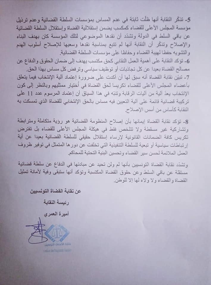 كما شدّدت على أنّ المنهج الإصلاحي يقتضي القطع مع "منظومة الفساد" وكلّ مظاهرها كالقطع بصفة كلية مع كلّ تبعيّة للسلطة التنفيذية، وتبيّن في هذا الإطار أنّ المرسوم عدد 11 كرّس في فصول منه تلك التبعية للسلطة التنفيذية من خلال آلية التعيين والإعفاء.