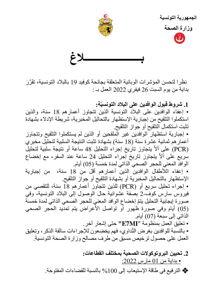 تقرر اليوم الجمعة 25 جويلية 2022، التخفيف تدريجيا بداية من غد السبت، من الاجراءات الوقائية المتعلقة بالتصدي لتفشيء فيروس كورونا على مستوى شروط قبول الوافدين على البلاد التونسية وتحيين البروتكولات الصحية بمختلف القطاعات، نظرا لتحسن المؤشرات الوبائية المتعلقة بجائحة كوفيد 19، وفق ما جاء في بلاغ صادر، عن وزارة الصحة .