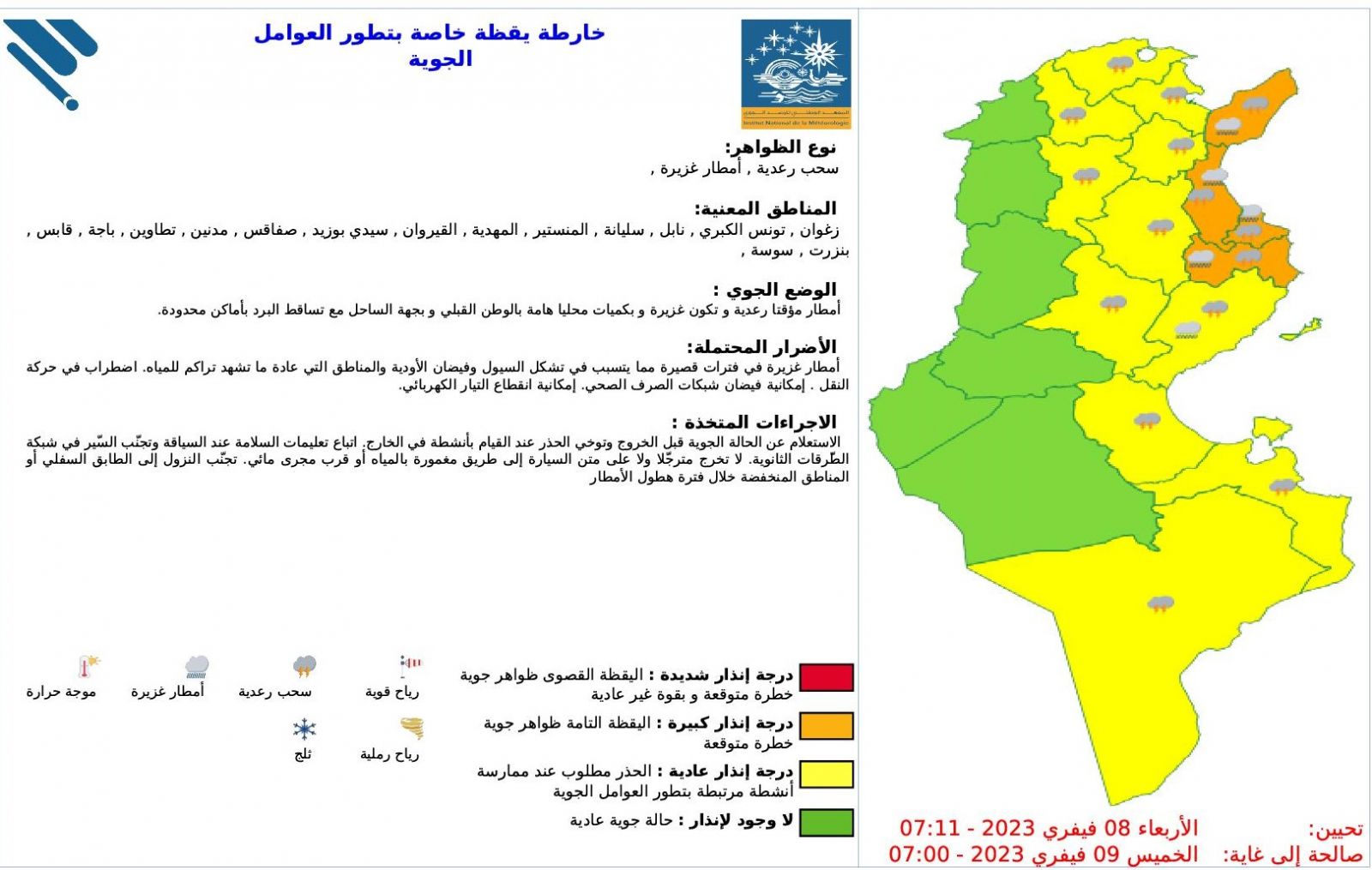 نشر المعهد الوطني للرصد الجوي صباح اليوم الأربعاء 8 فيفري 2023 خارطة اليقظة الخاصّة بتطور العوامل المناخية.