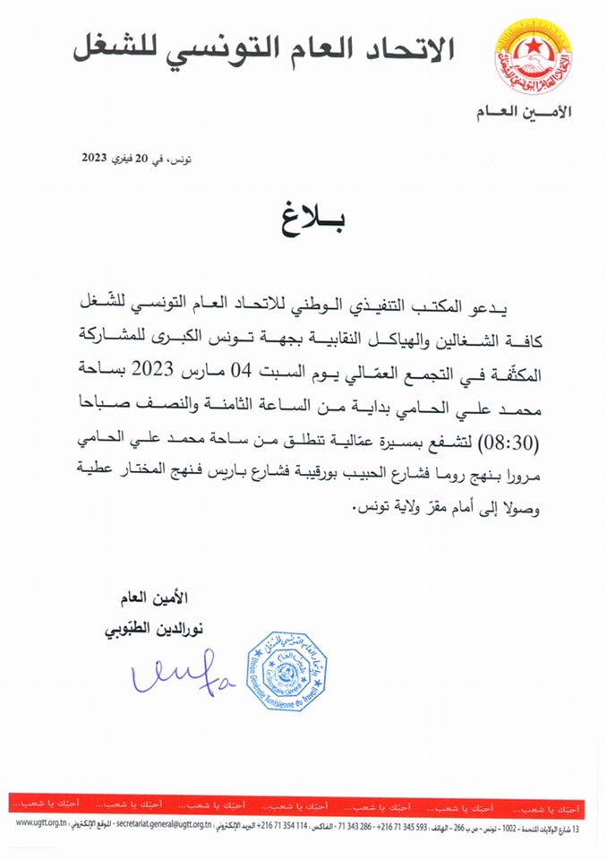 أعلن الإتحاد العام التونسي للشغل تظيم تجمّع عمّالي يوم السبت 4 مارس 2023 بساحة محمّد علي الحامي.