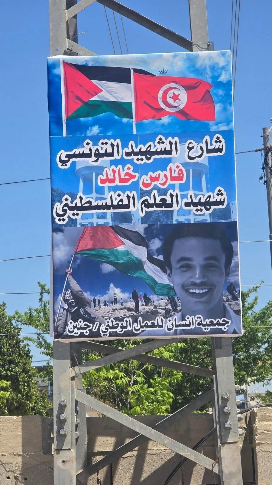تم تكريم شهيد العلم الفلسطيني "فارس خالد " الطالب التونسي الذي توفي يوم 7 أفريل 2025 من خلال تسمية شارع وسط مدينة جنين بالضفة الغربية باسم " شارع الشهيد التونسي فارس خالد , شهيد العلم الفلسطيني في جنين" في مبادرة قامت بها جمعية إنسان للعمل الوطني.