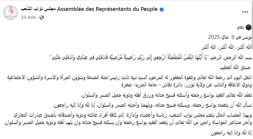 وتقدم مجلس نواب الشعب إلى أفراد عائلة الفقيد وذويه بعبارات التعازي ومشاعر المواساة، راجيا من الله تعالى أن يتغمده بواسع رحمته وأن يسكنه فسيح جناته وأن يلهم أهله وذويه جميل الصبر والسلوان.