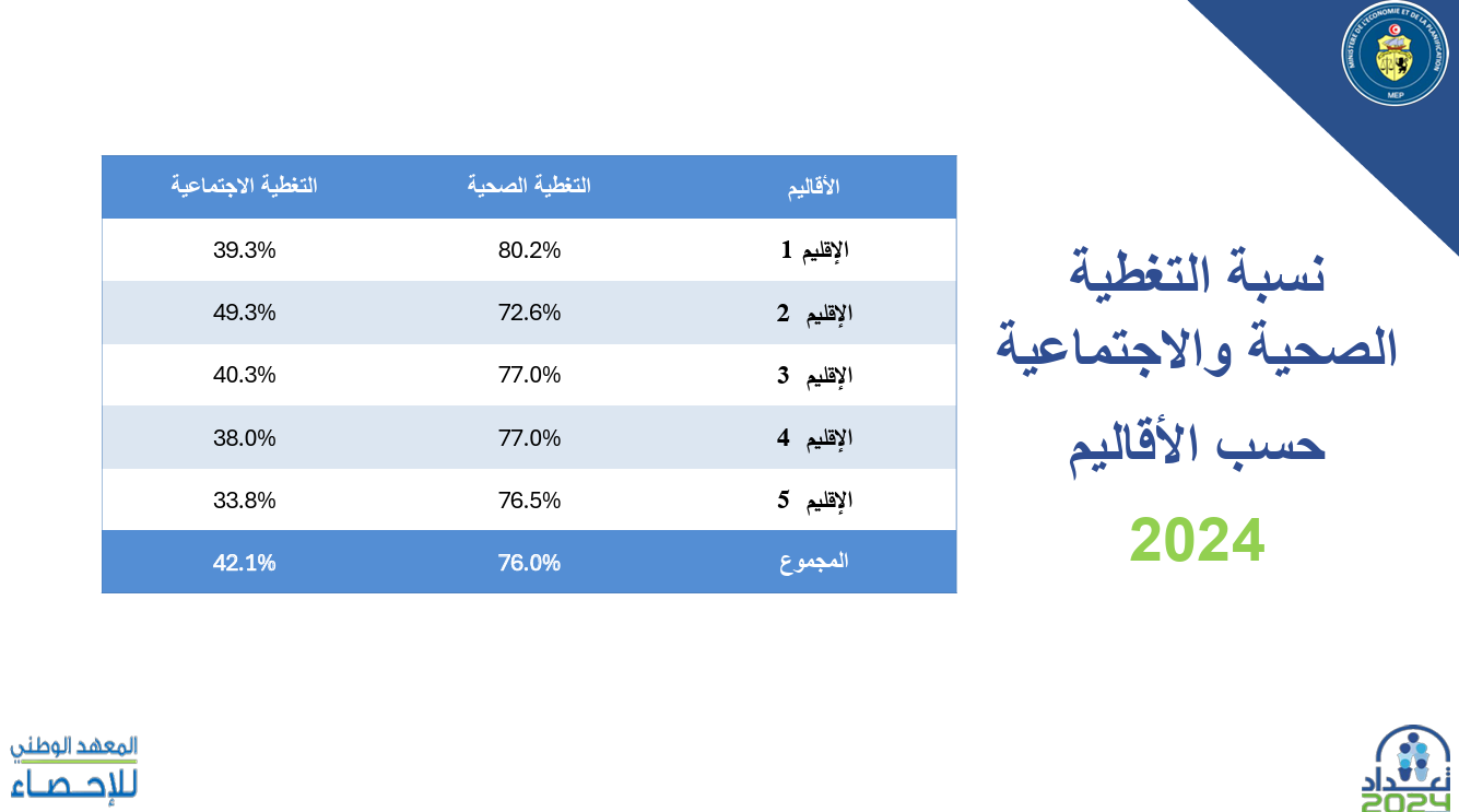 وأضاف أنّ النتائج المسجّلة ضمن التعداد العام للسكان والسكنى يجب أن تدفع الدولة للتفكير في حلول لتحسين مستويات التغطية الاجتماعية التي تنعكس على التغطية الصحية، مبيّنا أنّ من بين هذه الحلول الذهاب بأكثر جرأة نحو إدماج جانب كبير من القطاع غير المهيكل في القطاع المنظم.