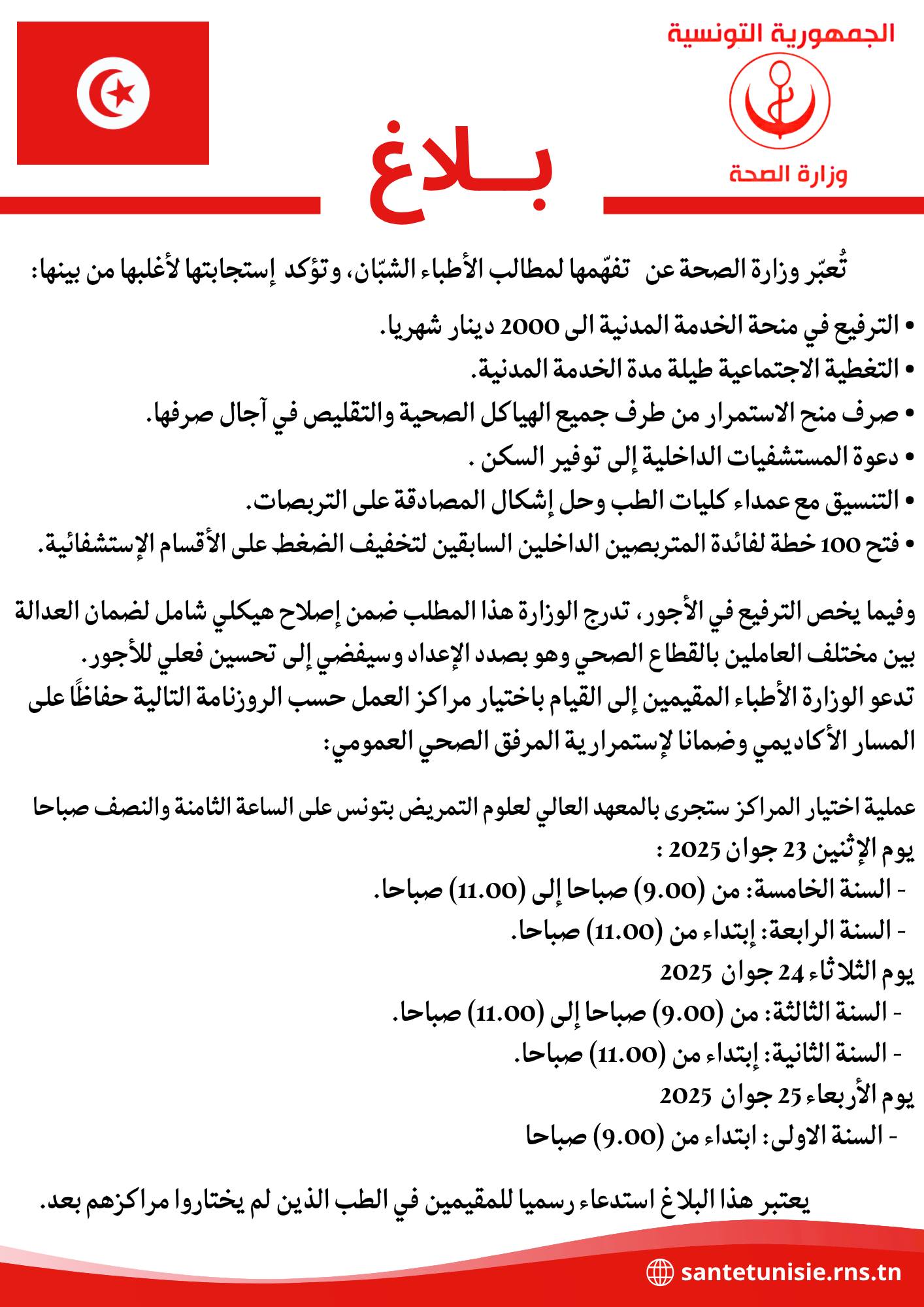 وشددت الوزارة على أن هذا البلاغ يعتبر استدعاء رسميا للمقيمين في الطب الذين لم يختاروا مراكزهم بعد.