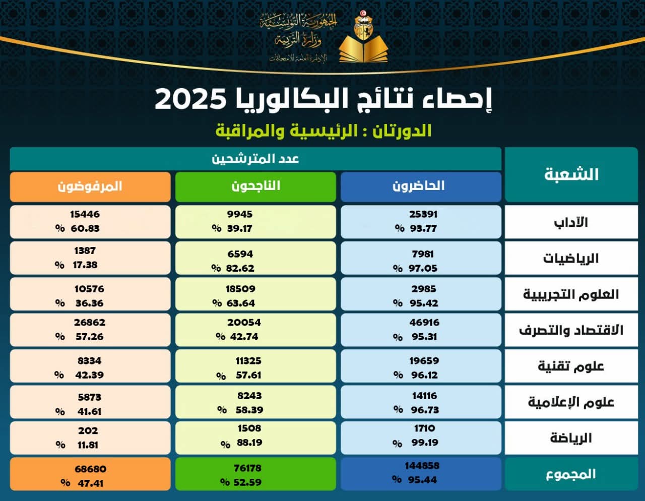 كشفت وزارة التربية اليوم الخميس 10 جويلية 2025، عن نسبة النجاح الإجمالية في مناظرة الباكالوريا خلال دورتيها الرئيسية والمراقبة والتي بلغت 52.59 بالمائة فيما بلغت نسبة المرفوضين في الدورتين 47.41 بالمائة.