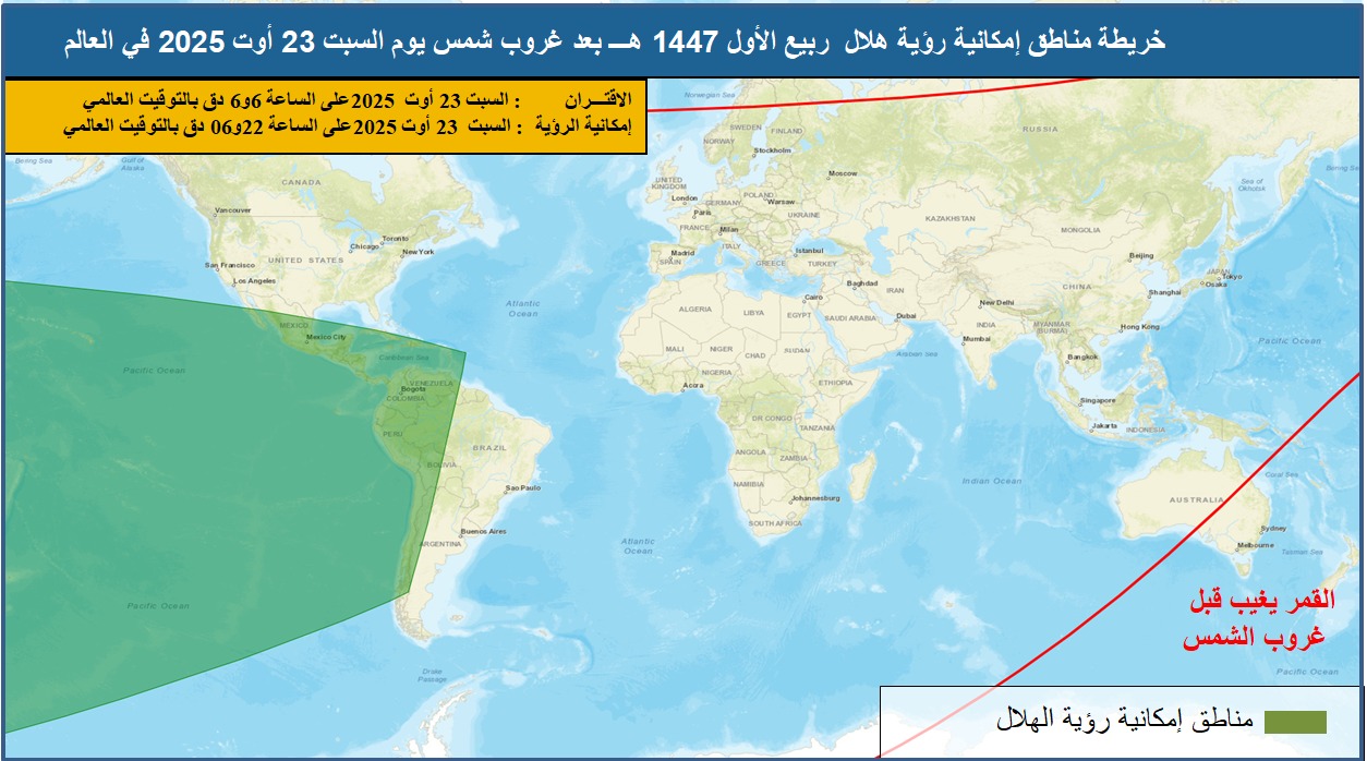 ووفق الحسابات الفلكية، يمكث الهلال بعد الغروب يوم السبت في معظم أنحاء العالم. وتبدأ إمكانية رؤيته ابتداءً من الساعة 23:06 ليلا (بالتوقيت المحلي) انطلاقا من خليج المكسيك ووسط أمريكا الجنوبية، ليمتد تدريجيا نحو الغرب.