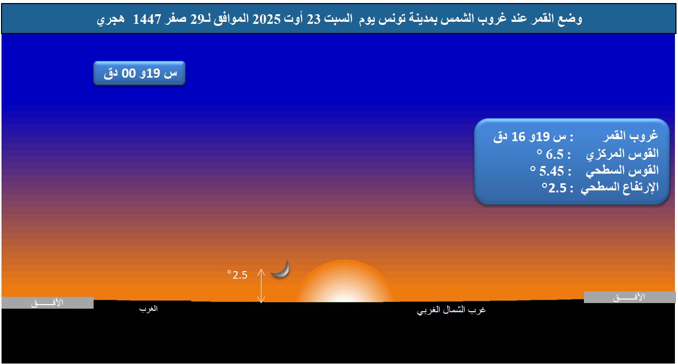 أعلن المعهد الوطني للرصد الجوي أنّه سيتم رصد هلال شهر ربيع الأوّل 1447 هجري، بعد غروب شمس يوم السبت.