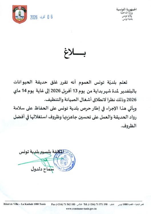 أعلنت بلدية تونس في بلاغ اليوم الثلاثاء أنه تقرر غلق حديقة الحيوانات بالبلفدير لمدة شهر بداية من تاريخ 13 أفريل 2026 إلى غاية يوم 14 ماي 2026، إثر انطلاق أشغال الصيانة والتنظيف.