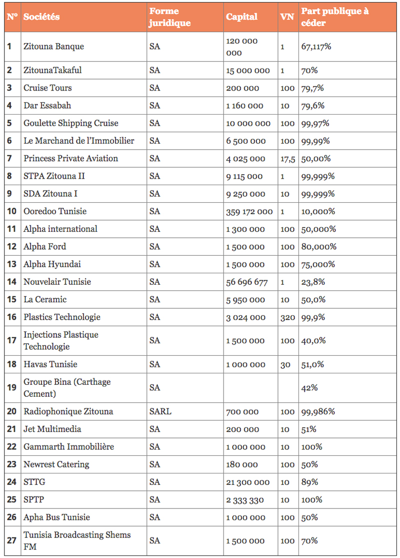 ستشرع الشركة القابضة كرامة هولدينغ في التفويت في نصيب الدولة بـ 27 شركة مصادرة تابعة لها على غرار بنك الزيتونة و شركة أوريدو وقرطاج للاسمنت.