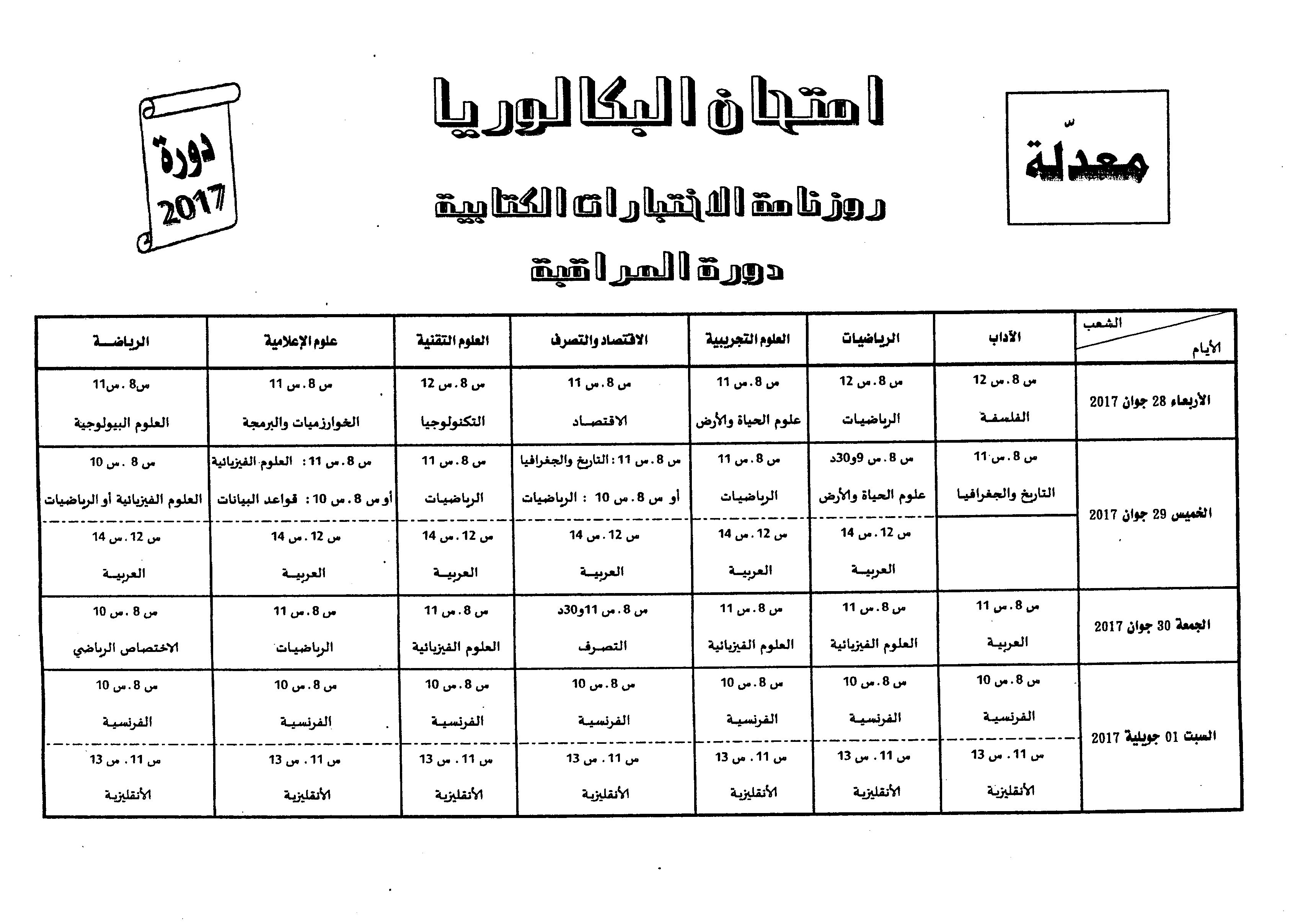 أعلنت وزارة التربية في بلاغ لها ، عن تأجيل دورة المراقبة من امتحان الباكالوريا (دورة 2017) بيوم واحد لتنطلق يوم الأربعاء 28 جوان 2017 عوضا عن الثلاثاء 27 جوان 2017، وتتواصل تبعا لذلك هذه الدورة على امتداد أيام 28 و29 و30 جوان 2017 وفق ما هو مبين في روزنامة الاختبارات الكتابية المصاحبة.