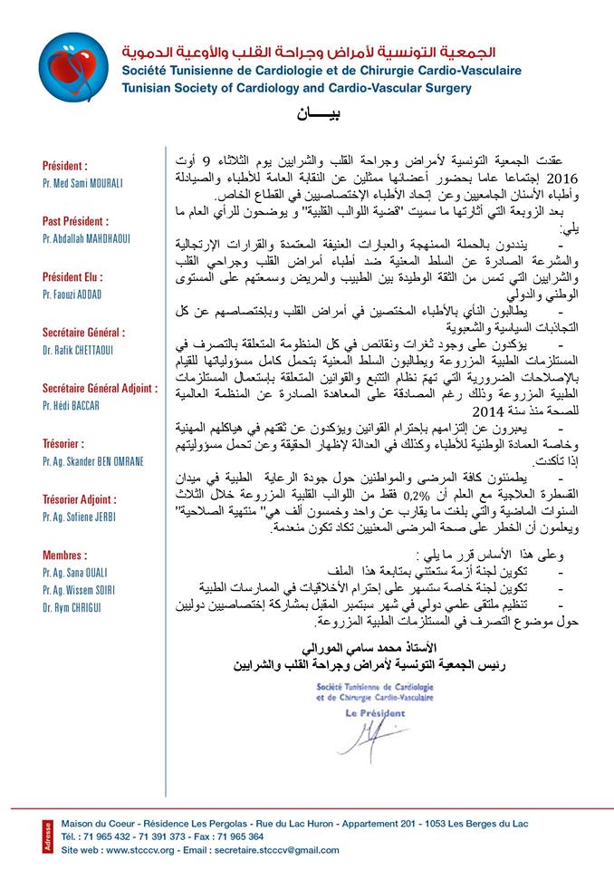 وندّدت الجمعية بما اعتبرتها ''حملة ممنهجة وعبارات عنيفة متعمّدة وقرارات ارتجالية الصادرة عن السلط المعنية ضد أطباء أمراض القلب وجراحي القلب والشرايين '' بخصوص ملف اللوالب القلبية منتهية الصلوحية.