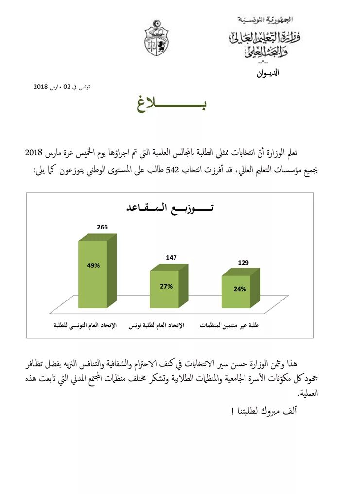 أصدرت وزارة التعليم العالي والبحث العلمي بيانا قصيرا كشفت فيه نتائج انتخابات ممثٌلي الطلبة في مجالس الكلٌيات.وشكرت المنظٌمات الطٌلاٌبيٌة ومنظمات المجتمع المدني على جهودها في إنجاح هذه العمليٌة.
