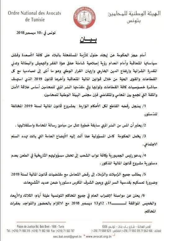 أعلنت الهيئة الوطنية للمحامين بتونس عن مواصلة الإضراب العام في جميع المحاكم التونسية طيلة أيام الثلاثاء والأربعاء والخميس الموافقة لـ 11 و12 و13 ديسمبر 2018 مع الالتزام بالحضور والتواجد بمقرات المحاكم.