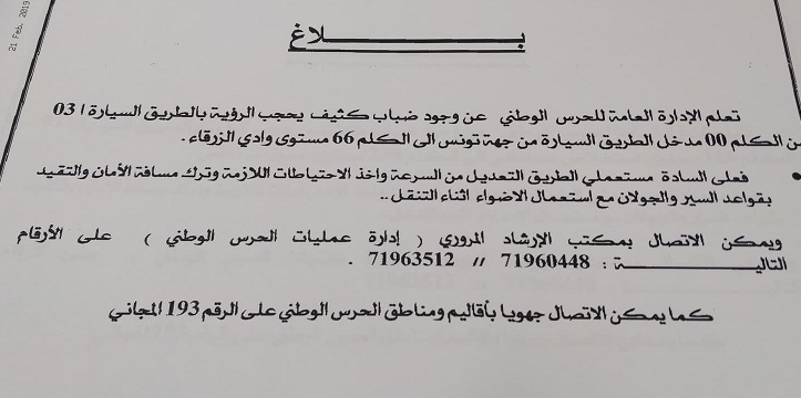 دعت الإدارة العامة للحرس الوطني مستعملي الطريق الى التعديل من السرعة والتقيد بقواعد السير والجولان واستعمال الأضواء الرفافة أثناء التنقل بسبب وجود ضباب كثيف يحجب الرؤية بالطريق السيارة أ 1 تونس الحمامات على مستوى محول رادس وعلى مستوى محطة الاستخلاص مساكن وبالطريق الوطنية ا 3 على مستوى وادي الزرقاء.
