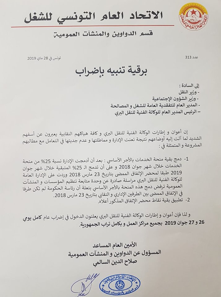 أعلن أعوان وإطارات الوكاللة الفنية للنقل البري الدخول في إضراب عام كامل يومي 26 و27 جوان 2019، بجميع مراكز العمل وبكامل الجمهورية.
