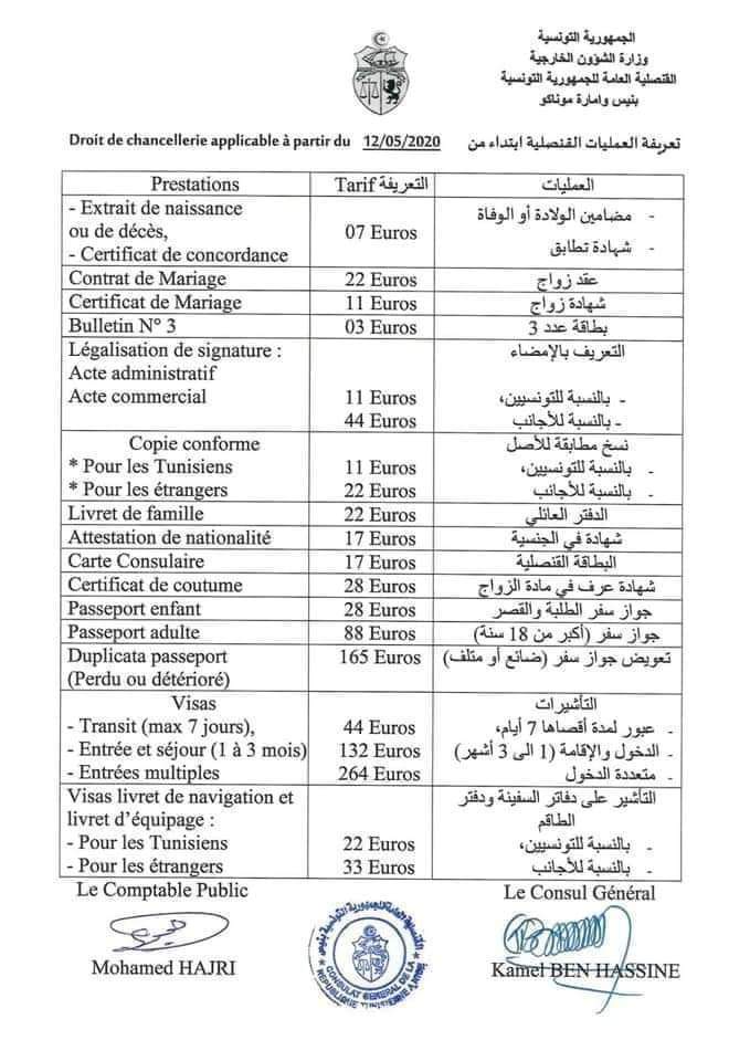 أكد مدير الإعلام بوزارة الشؤون الخارجية بوراوي الإمام لموزاييك، اليوم السبت 9 ماي 2020، أن تعريفات العمليات القنصلية هي عمليات جبائية تحددها وزارة المالية ولا تدخل ضمن مشمولات وزارة الشؤون الخارجية، مضيفاً أن البعثات القنصلية التونسية بالخارج مطالبة بتنفيذ هذه الاجراءات الجبائية التي تقرها الحكومة التونسية.